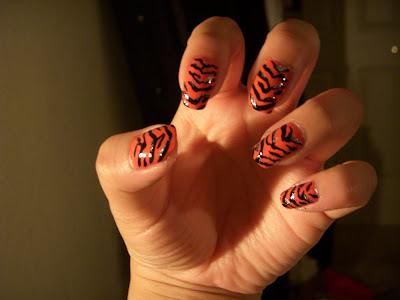 Then came this design. I really like them. I must say though. I've been pretty sloppy lately, getting nail polish on my cuticles and stuff, but it's fine because it comes off in the shower the next morning. Oh, and look how short my thumb nail is! I broke it. Total bummer.